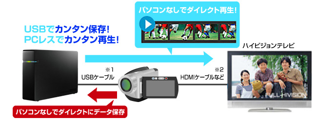 また、JVC「エブリオ」、ソニー「ハンディカム®」などのビデオカメラとUSBケーブルを利用して接続して、ビデオカメラを操作すれば撮影したハイビジョン映像をパソコンを介することなくハードディスクへ保存が可能。