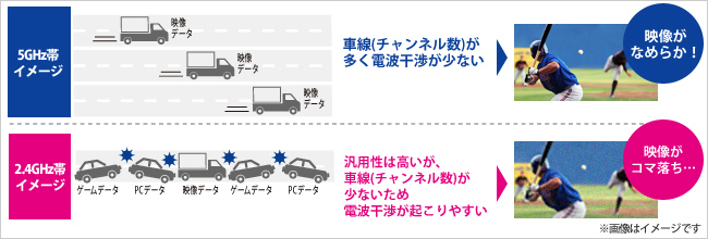 家庭内にある無線機器からの電波干渉などが原因となる不安定な通信の場合も考慮し、一般的によく使われる2.4GHz×2本、利用機器が少なく電波干渉が起きにくい5GHz×2本と計4本の内蔵アンテナを備えていて、これまで電波の弱かった場所を解消し、家の隅々まで行きわたる強力な無線LAN環境を整えることができる。