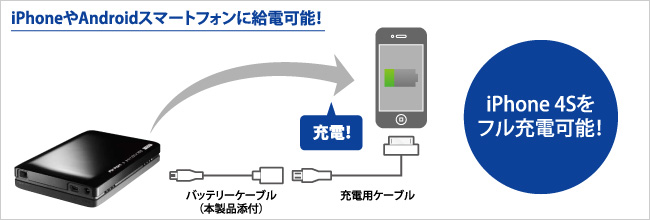 また、製品に添付されているUSB給電ケーブルを使えばスマートフォンへの充電も可能だ。