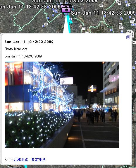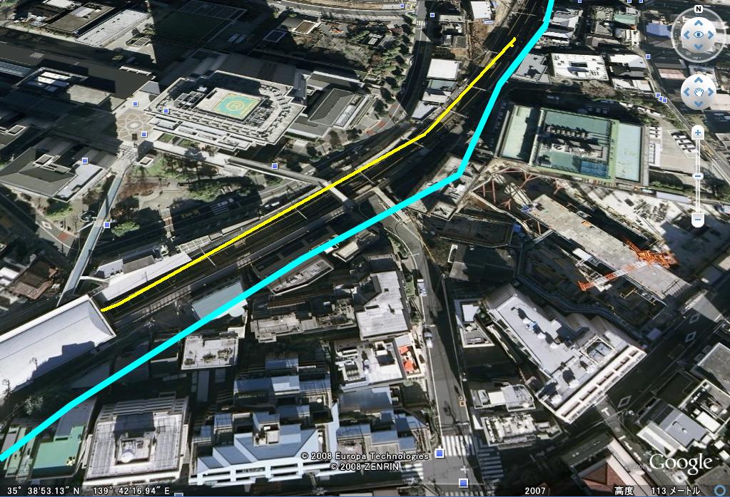電車で移動しているところなので、本来は、黄色の線(適当だけどw)のはずが、Routeログは水色のラインを走っています。