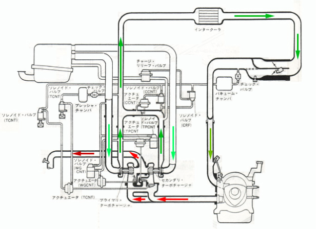 シーケンシャルターボはタービンを一回り小さくする事で低回転からターボを効きやすくする。高回転になったら2つ目のタービンを上乗せする。理想的です。が、逆にタービンの切り替わりで「谷」が出てしまいます。また機構が複雑なので、へたりが出てくると修繕が大変です。有名な漫画「頭文字D」でも、名ゼリフ「セカンダリータービン止まってんじゃねーのか?」ってのがありますが、これは実際にはパイプ裂けなどの漏れが多いです。タービン本当に固まってると、排気干渉などで酷い事になるはず。