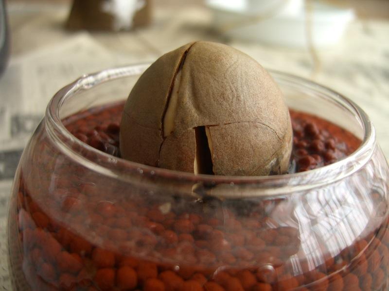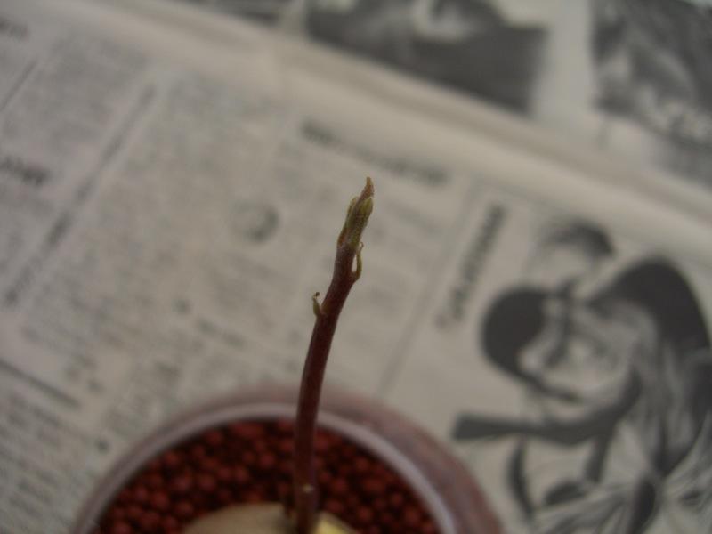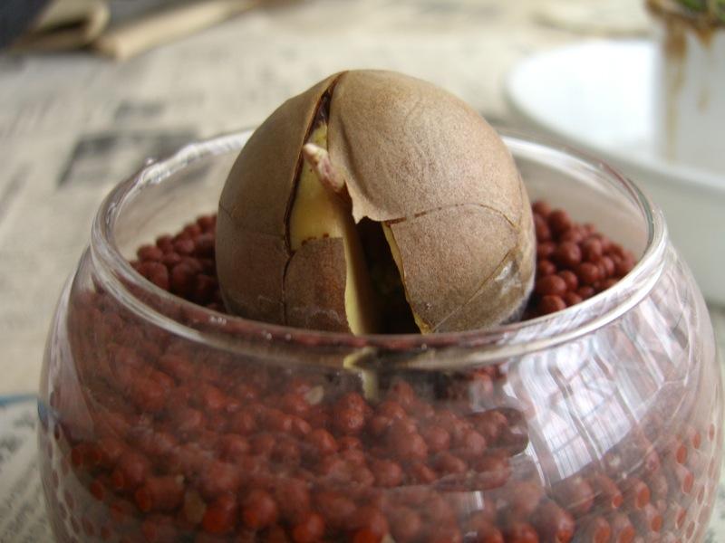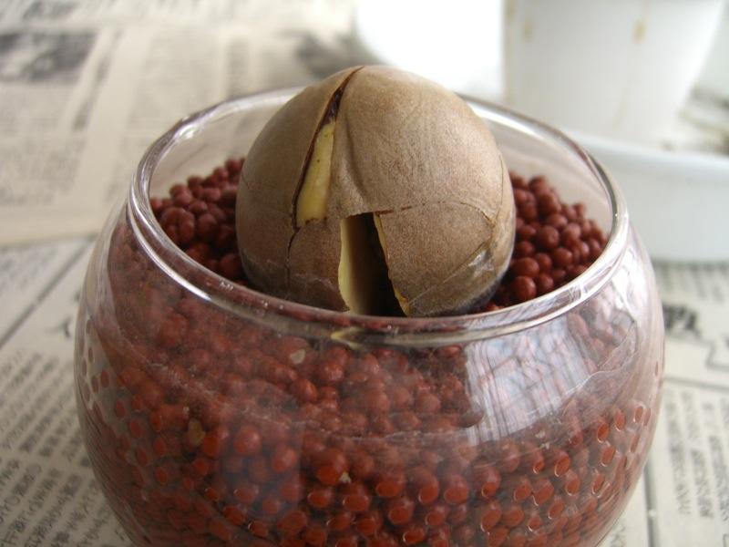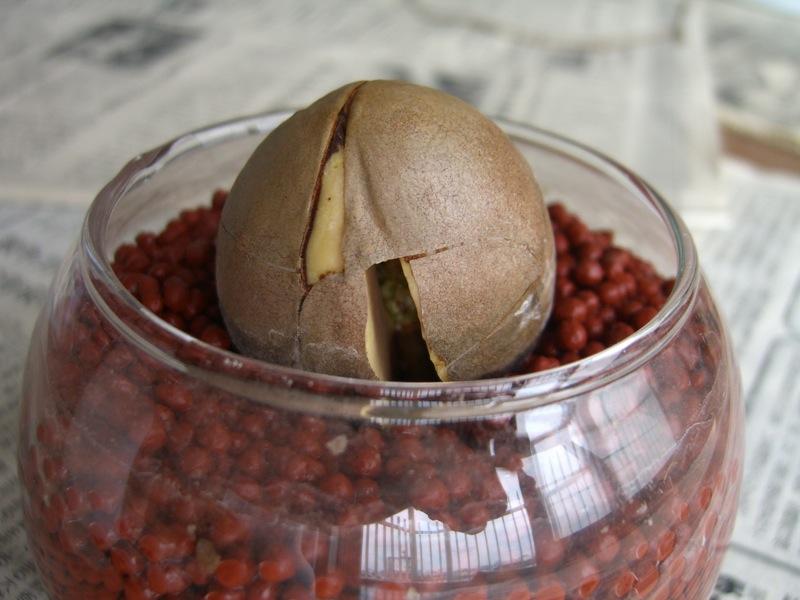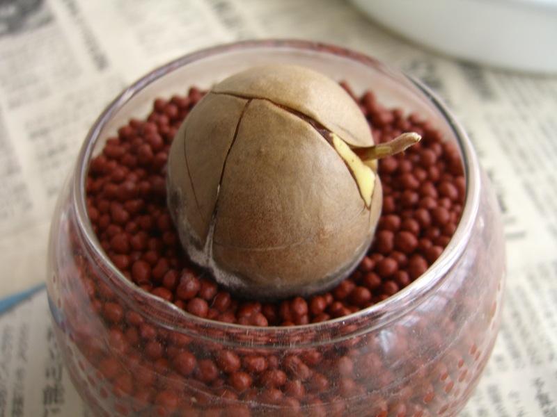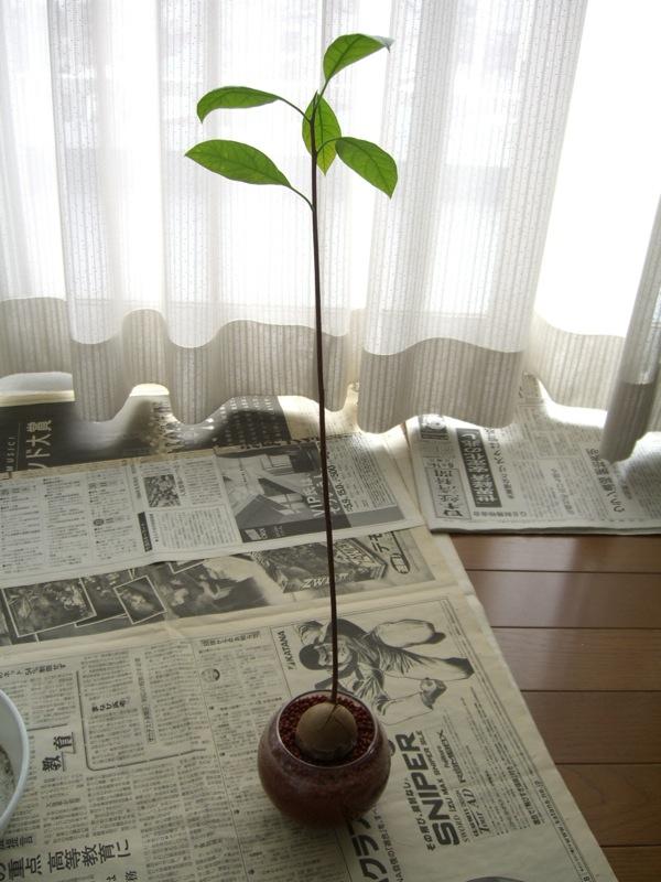 その説明にある育て方は「3本の爪楊枝を胴回りに120度の間隔で突き刺し、水を入れたビンの上に橋渡しをして、種の下半分を水に浸す」というもの(文章で伝えるのは難しいね)。
