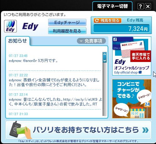 当初はクレジットカードと一緒の Edyを使っていたので、こちらを使用し PC経由で入金及び残高確認をしていました。