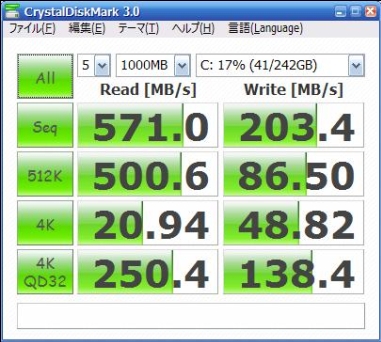 SATA6Gbps対応のSSDです。まだ3Gbps環境ですが270M程度出ています。Corei7980Xを導入予定なので、合わせて6Gbps環境にする予定です。※4/29現状で分かった...