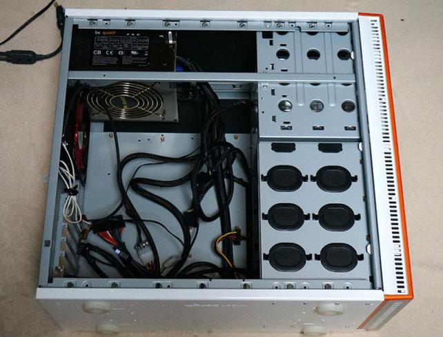 また自分の構成は3.5インチHDD2台にSSD1個とドライブ類が控えめな構成なので3/4段目にHDDを搭載し、2段目に小さなSSD、そして1段目のトレーはどうせ使わないのではずしてしまう。これにより上段の9cmファンの風がほぼ直結でCPUクーラーへ行ってくれる。