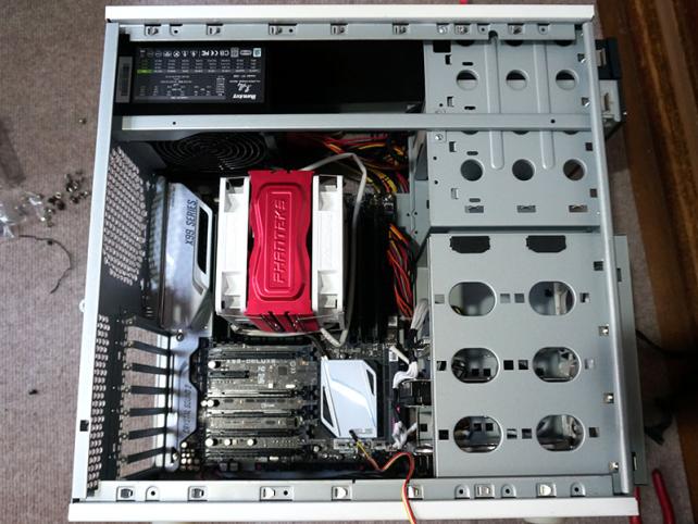 ASUS X99 DELUXEの優秀なファンコントロールもあり気になっていた負荷時CPU温度の上昇もケースファンをぶん回せば許容範囲。長時間負荷をかけまくる用途でなければSoloも結構いけるじゃないか。この状態だとゴオオオという低い音がするが前のケースでも結局負荷時はぶん回していたのでこんなもんだ。
