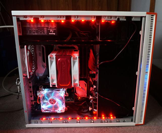 そうなんですよ、PHANTEKSの赤いクーラーが存在感抜群。元々前のケースの高さ制限にあわせて買ったやつだけど、赤かっといてよかった。