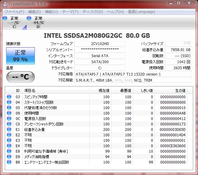 現状の使用時間や、総書き込み容量です。