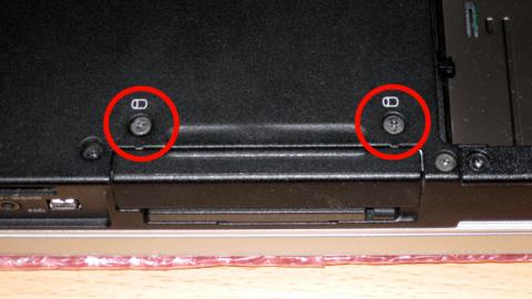次はHDDを本体から取り外します。XPS M1710のHDDベイは本体の脇に位置しています。HDDマークのある2本のネジ(赤丸で囲んであるネジ)を外してください。ネジは小さいので無くさないように注意です。