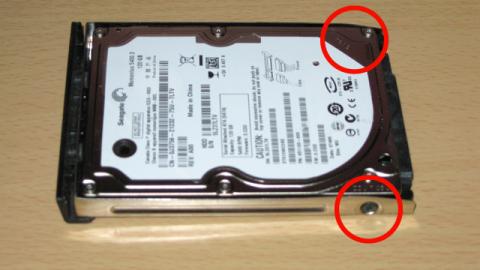 2本のネジを外したらHDDマウンターを引き抜きます。HDDマウンターの左右二箇所のネジ(赤丸で囲んであるネジ)を取り外します。