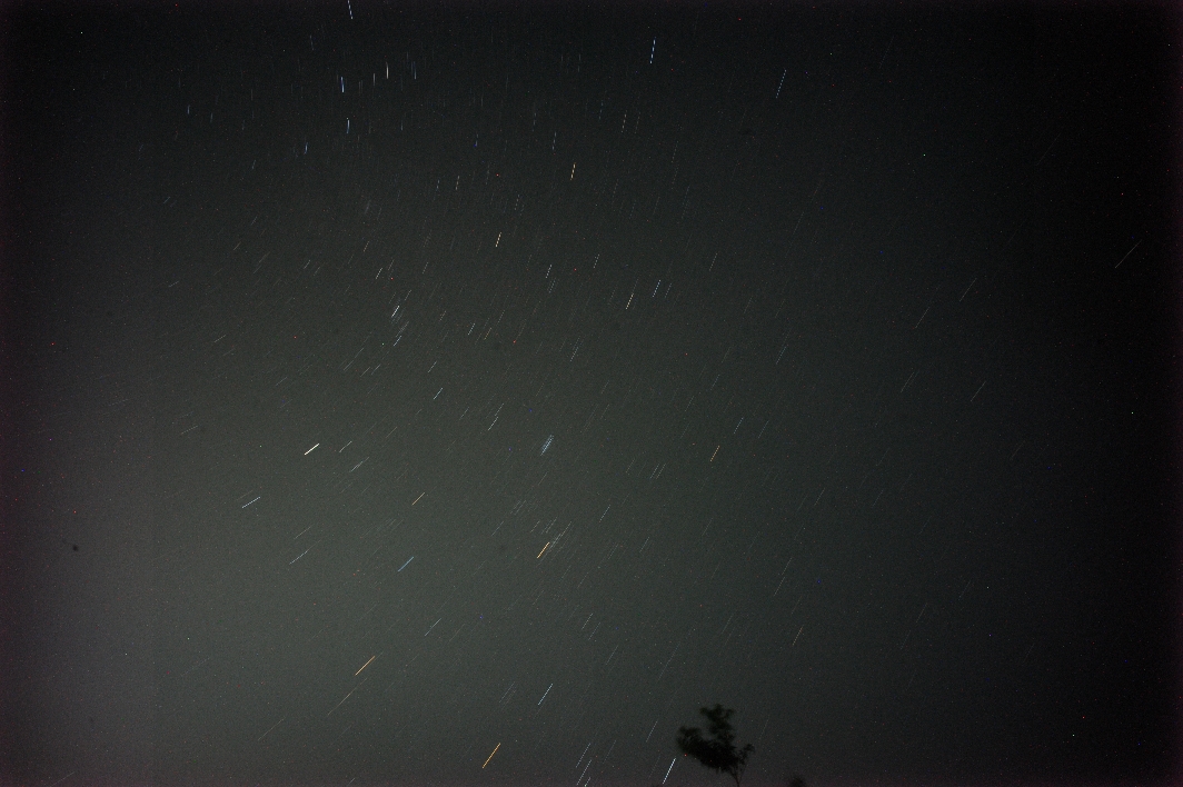 【写真3.】【写真2.】の構図のままモータを止めて10分露出しました。北天と南天で曲線の中心が違いますね。