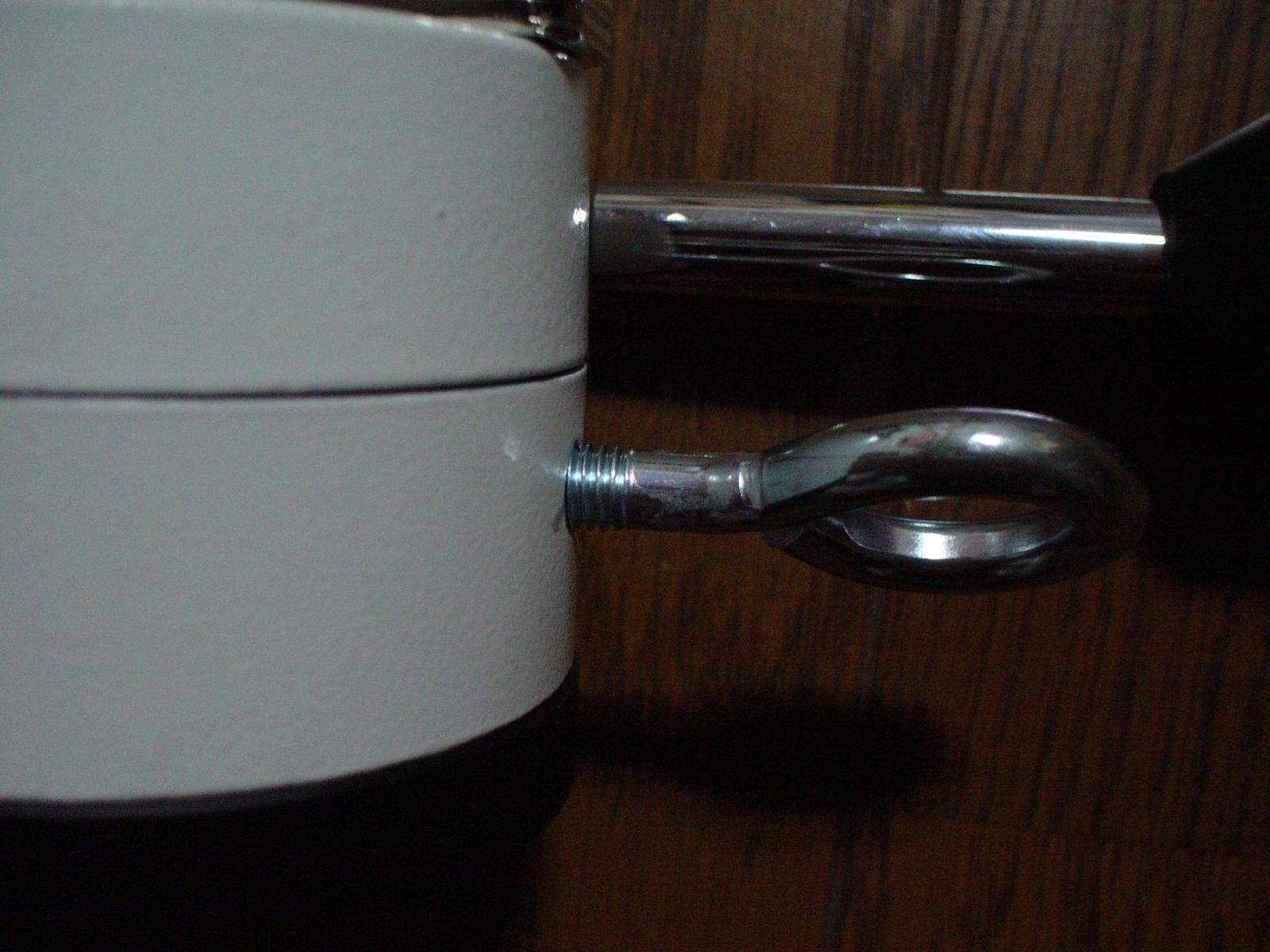【写真2.】本来の用途でははいようですが、団扇ネジの代用になりそうと、保険で買っていた丸カンボルト8x40mm(84円)が決まりました。当たらない位置で止まります。