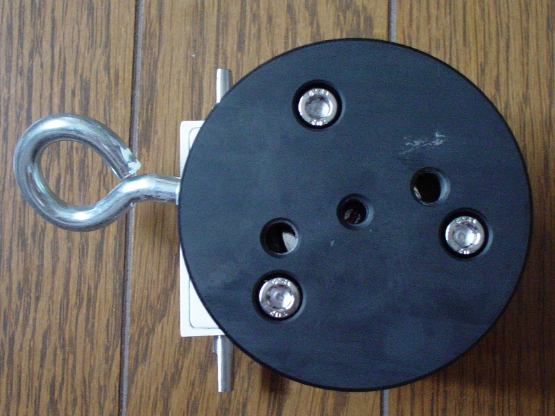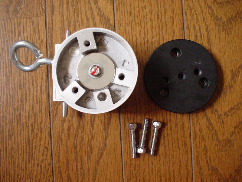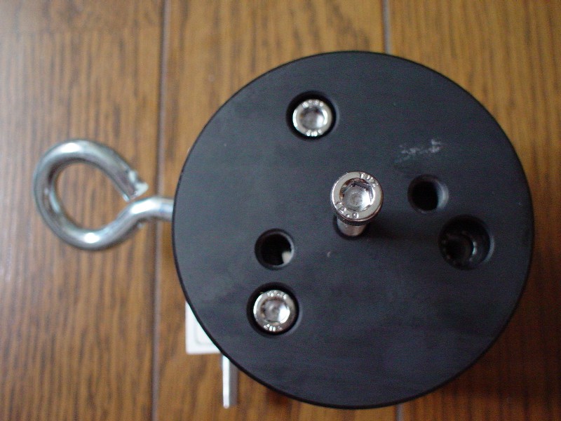 トップの写真2にみえる3本のキャップネジは、レンチサイズが合わない(4番と5番の間のようです。)ので外すことが出来ませんでした。この黒い円盤の中心に12mmの穴を開けてプレートを省略することができれば良いのですが。