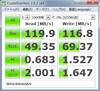 WD6400AAKS×5台でRAID0でシステムドライブで使ってます。P5K-EのICH8Rを使ってます。一応ベンチを載せておきます。何故かプリントスクリーンが機能し...