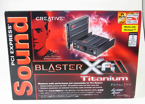 Sound Blasterとしては初のPCI expressインターフェイス対応製品となる「X-Fi Titanium」。その登場時最上位モデルに位置づけられていたのがこの「Creative PCI Express Sound Blaster X-Fi Titanium Fatal1ty Champion Series」。08年の発売だから既に5年前。サウンドカードはPCパーツとしてはモデルライフが長くこれでもモデル的には2世代前、チップを見ると1世代前となる。