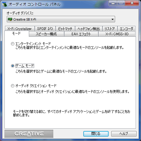 しかしCreativeの伝統というかお家芸。ぶっちゃけ使いにくい。「エンターテインメントモード」「ゲームモード」「オーディオクリエイションモード」と3つのモードが切り替えられるのだが、モードによって同じ名前のタブでも設定できる内容が変化したり、はなから設定項目が変わったり。