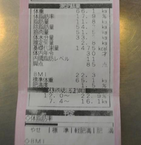 これは時々利用するスポーツジム備え付けの体組成計の数値 タニタ製です。