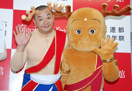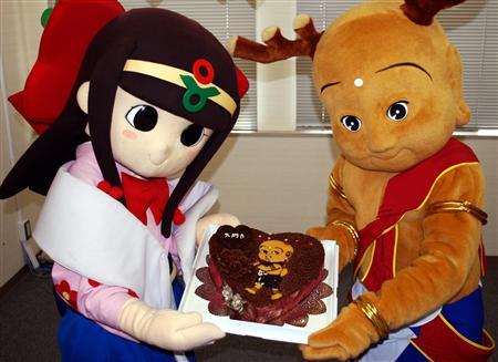 奈良県葛城市のマスコットキャラクター「蓮花(れんか)ちゃん」が12日、奈良市内で平城遷都1300年祭の公式キャラクター「せんとくん」にチョコレートケーキを手渡した。