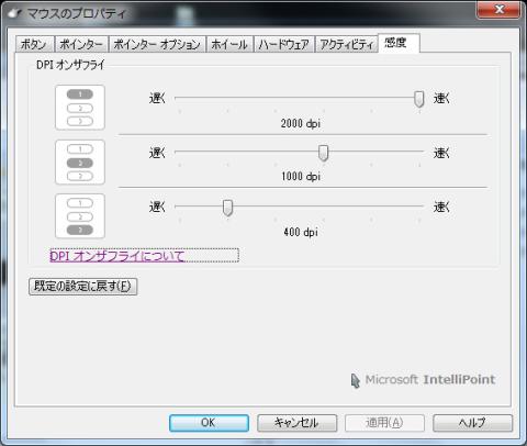 付属ソフトの『Intelipoint』をインストールするとマウスのプロパティが拡張されてマウス感度を変更できるようになっています。感度は200、400、800、1000、1600、2000の6段階に変更でき、マウスホイールの下にある専用ボタンへ割り当てることができるので、マウスのプロパティを開かなくても感度をボタン一つで変更できるのは便利です。普段のネットサーフィンやゲームにはサクサク動くよう2000に設定し、画像の編集等緻密な作業が必要な場合は400とボタン1つですぐに変更できます。また感度変更をした場合、左側についているディスプレイに感度が数値として表示されます。