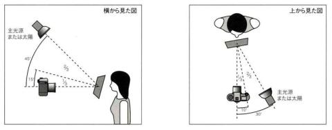 添付されていた使用法には「光がムラ無くグレーカードに当たるように、また色物の反射による影響やグレーカード表面のテカリを防ぐために、光源やカメラとの角度にご注意ください。」とあり、光源とカメラとグレーカードの適切な角度の説明図があります。