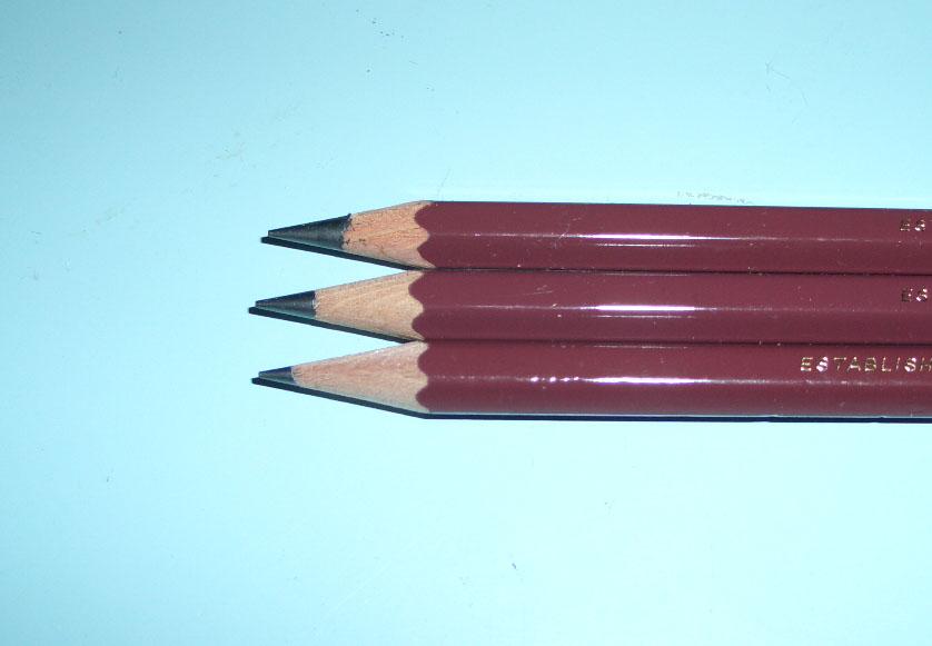 当たり前ですが、芯の太さの違いで、先が同じ角度になるように削っても、芯の出方がまるで違いますね。