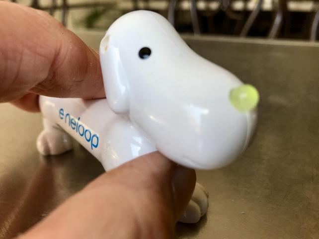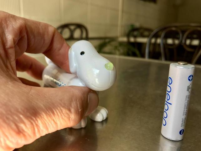 電池を食べさせた後 胸の小さなボタンを押すと 鼻が光ります