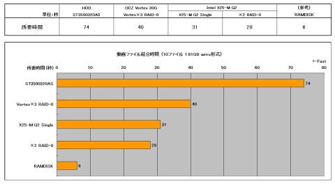 この作業では、X25-M G2の優れたランダムアクセスの性能がハッキリと数字に出ていますね。動画編集に限らず、細かい単位でのランダムアクセスが大量に発生するような重い作業は、VertexよりもX25-M G2の方が向いていると言えそうです。