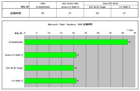 HDDに比べてSSDの方が起動が速いことは容易に想像がつきますが、意外にもVertex、X25-M G2共に起動時間に大きな差はありませんでした。起動時は順次読み出し、ランダム読み出しが多くなるはずですが、必ずしもCrystal Disk Markの結果と連動しない点が興味深いですね。