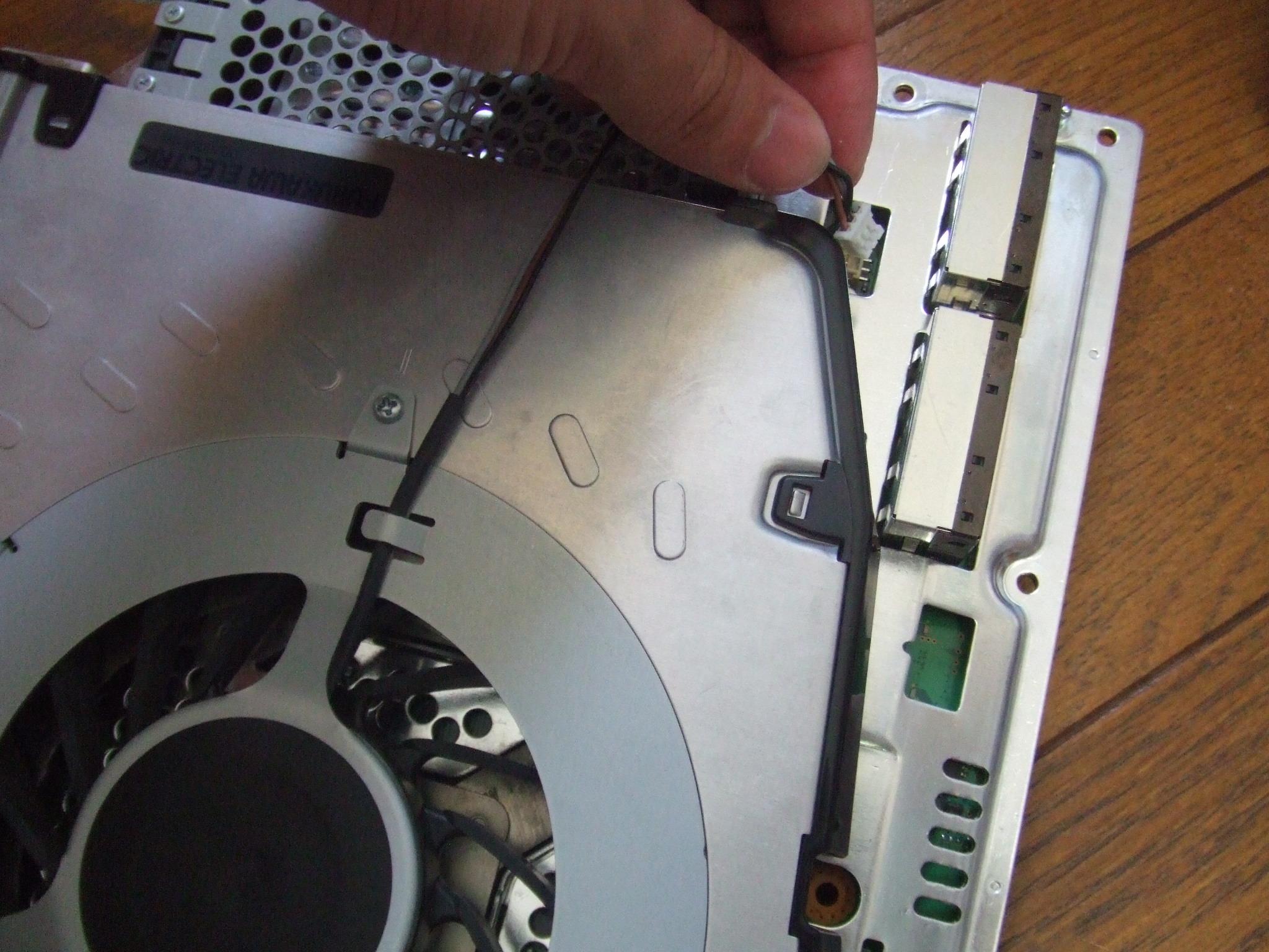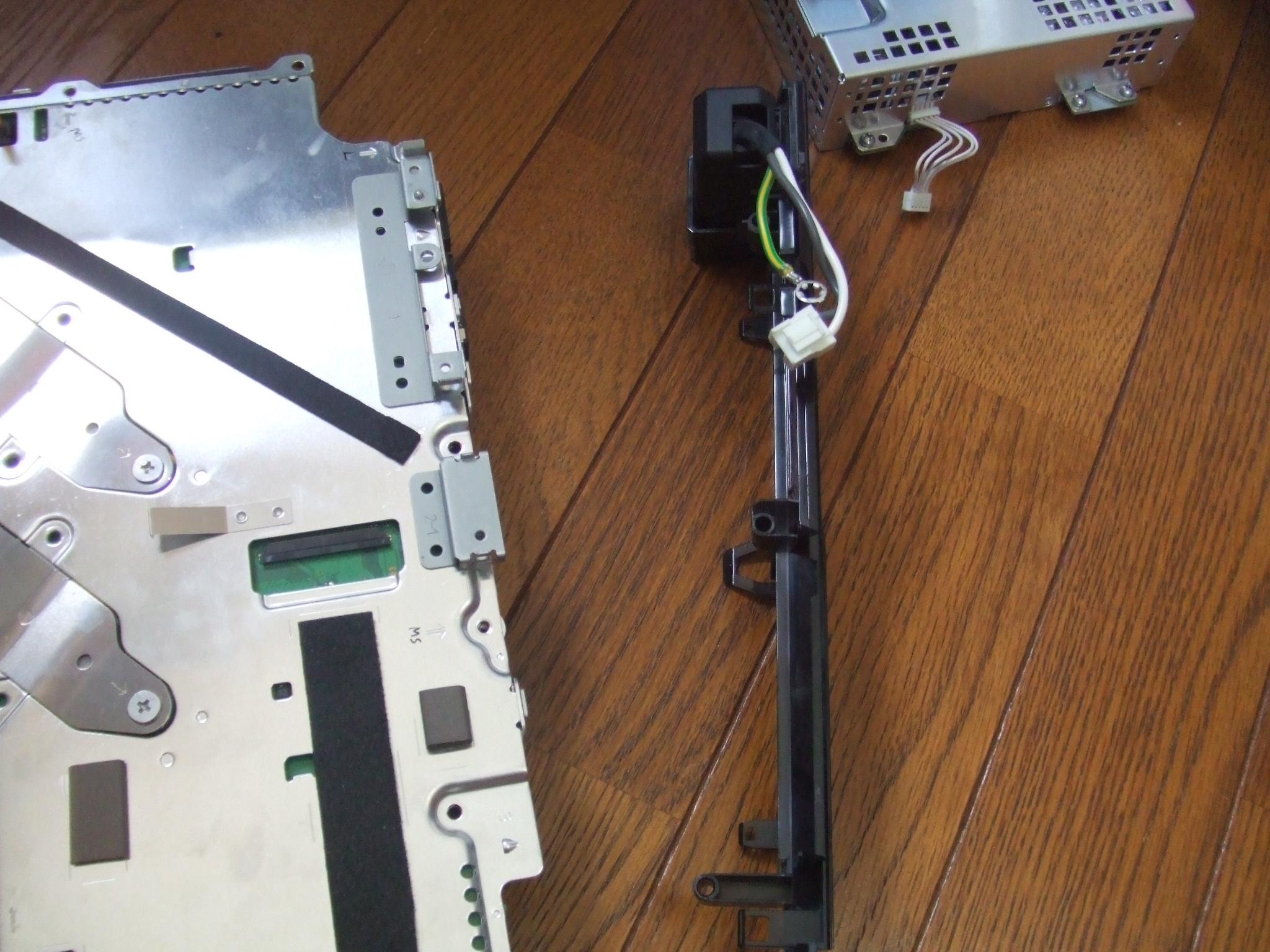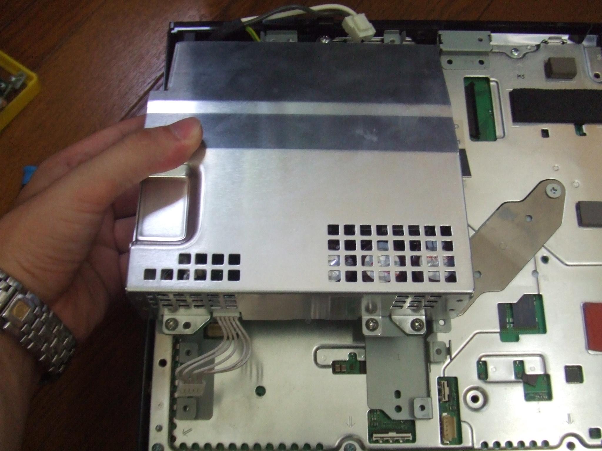 ネジを6箇所、白い電源コネクタを抜き、電源ユニットを引っこ抜きます