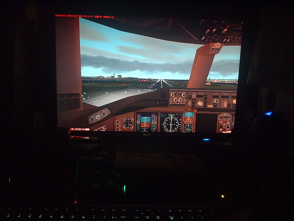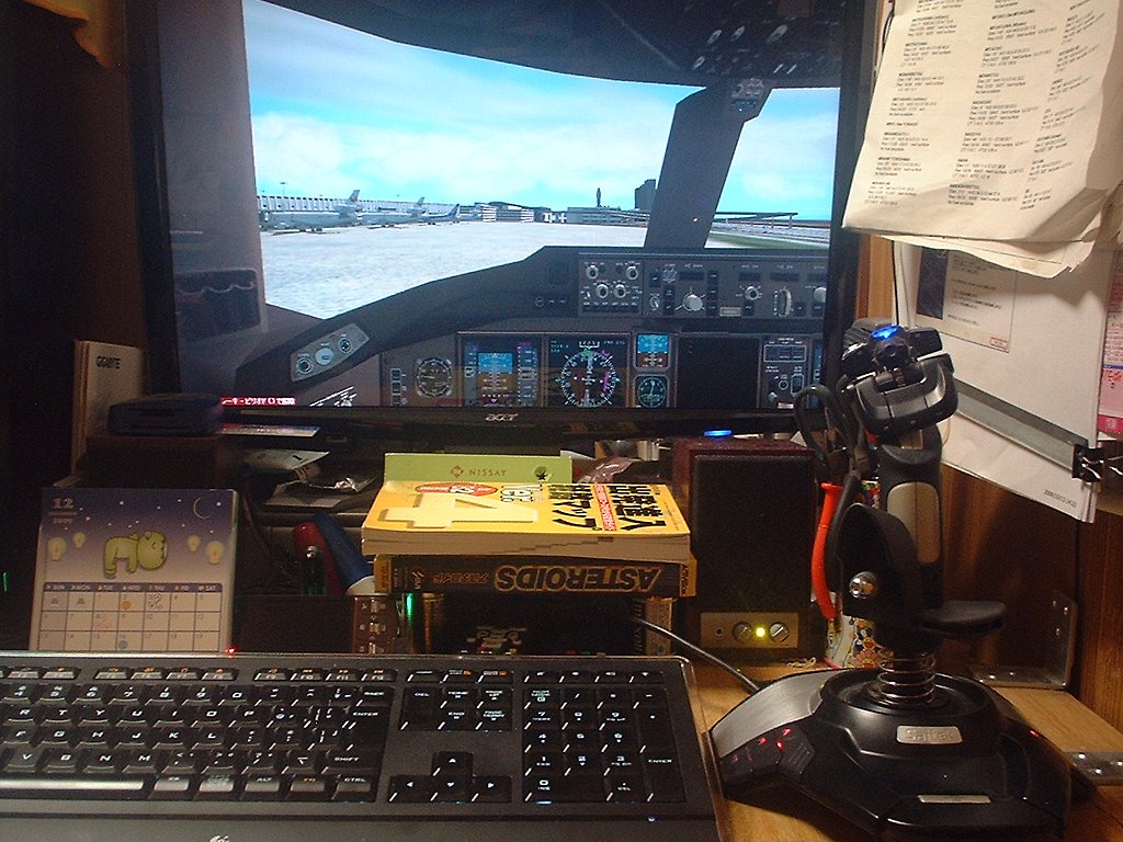 本当にコックピットと言えるほどの代物ではなく、単にパソコンにジョイスティックとラダーペダルを繋いだだけです。フライトヨークやスラストレバーもないし、モニターも24インチのシングルディスプレイです。必要最小限の環境で飛んでます。