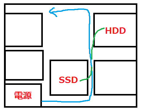 私の場合は、電源のケーブル(4ピンのもの)を青い矢印のように伸ばして、途中の4ピンにこの製品を取り付け、SSDとHDDに電源を供給しています。