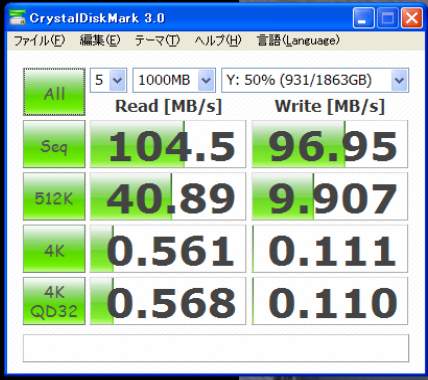 データ保存用ディスクとして使用していますので、何よりも容量と信頼性が重要で、速度に関してはそれほど重視していませんが、取りあえずベンチテストの結果を貼っておきます。