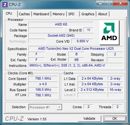 CPU:AMD Turion Neo X2 Dualcore Processor L625 (200MHz * 8 = 1.6GHz)