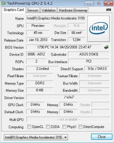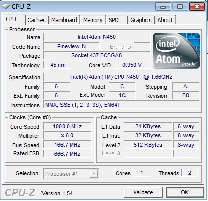 CPU名:インテル Atom プロセッサー N450 (1.66GHz)