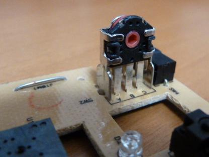 ③ホイールを取り付けている基板のSW部分のカシメ部4か所をラジオペンチなどでカシメる。