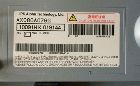 パネルの部品番号:AX080A076G、「MADE IN JAPAN」ですね!
