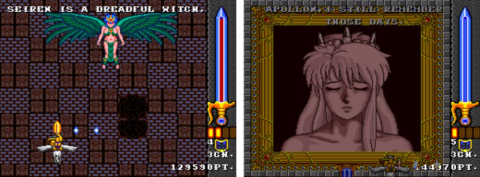 『フェリオス』は、1989年にナムコが開発したアーケードゲームで、本作はそのメガドライブ版です。ギリシャ神話が下敷きになっており、プレイヤーはペガサスに乗った主人公アポロンを操作して、邪獣デュポンに連れ去られてしまった恋人アルテミスを助け出すことが目的。