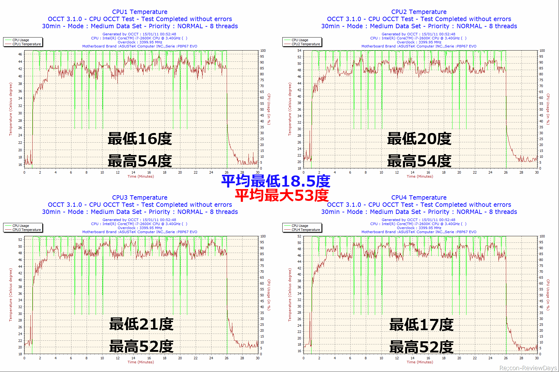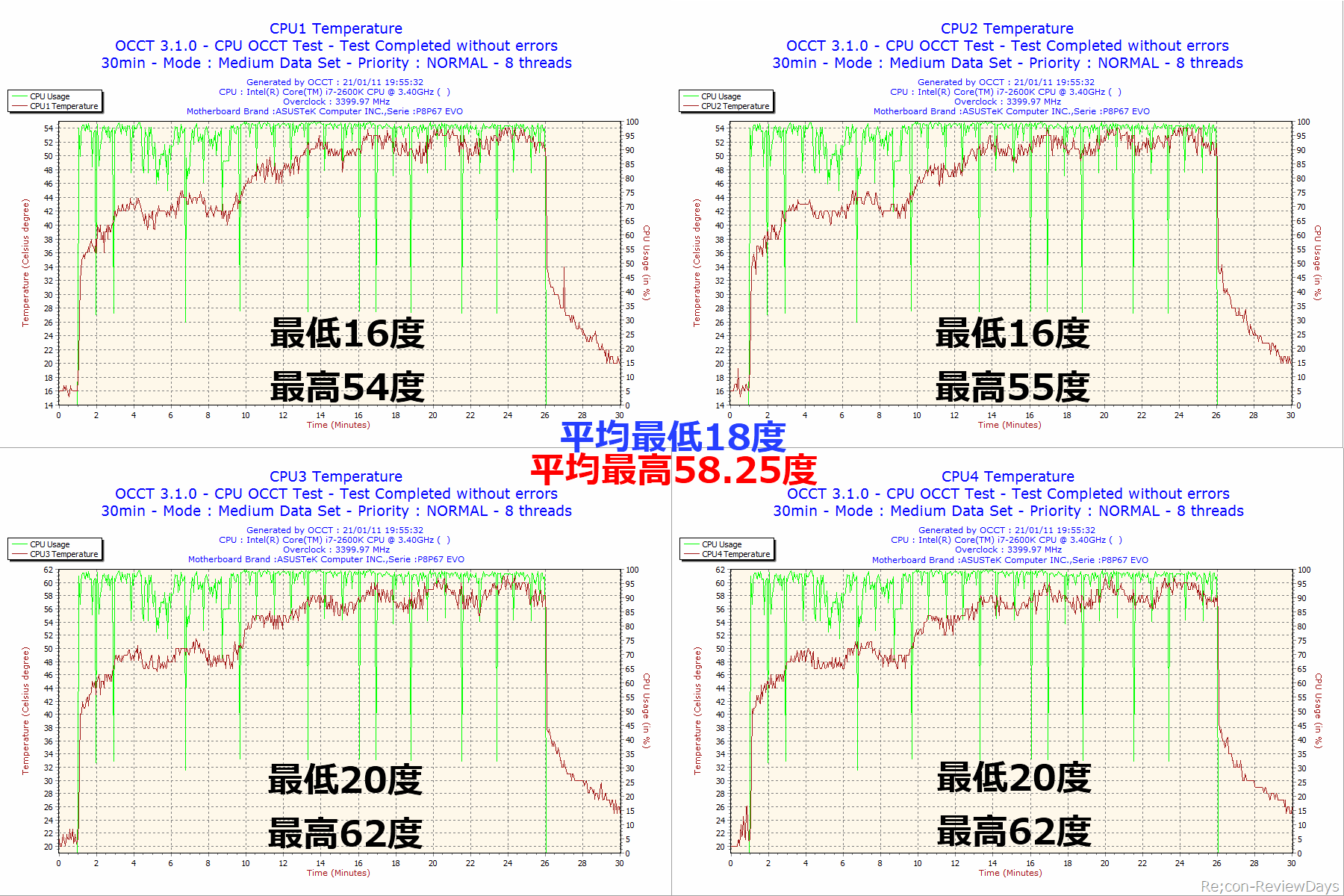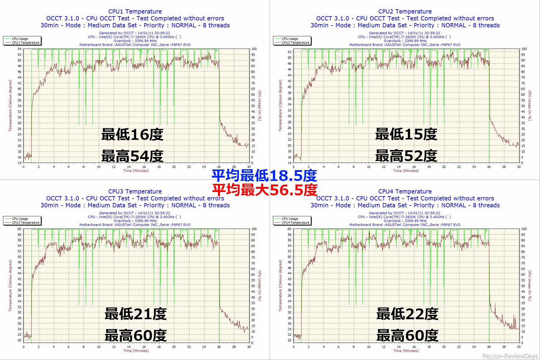 またOCCTが倍率変更に対応していないせいかクロックが定格のままとなっていますが4.5GHz 1.3Vでの検証となっています。