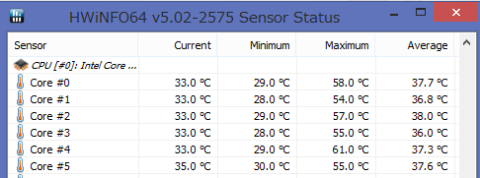 FF14ベンチをインストール直後の無設定(ノート用高設定)で回したところ、5930kはベンチ中60度近くまで上昇。定格3.5Gなので、まぁ実用域ですね