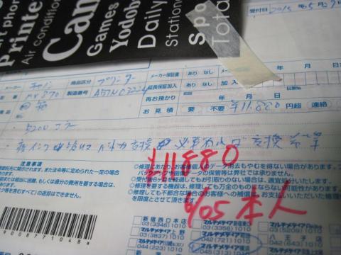 <追記 2015年10月15日 修理完了>