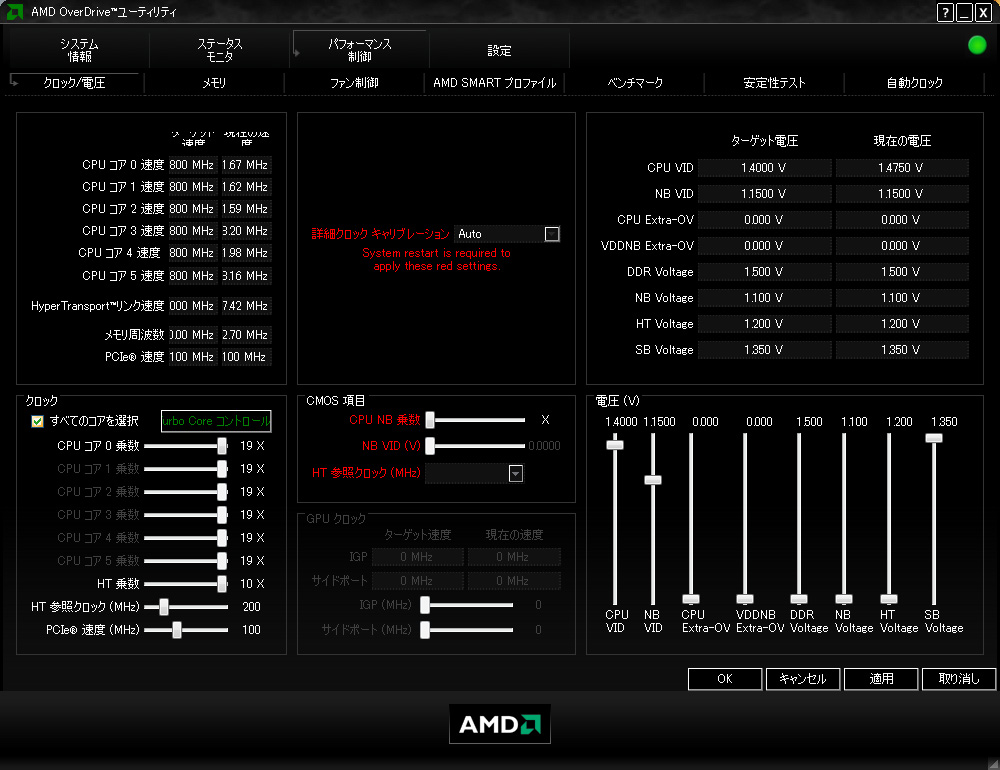 そこでAMD OverDrive Utility(AOD)を使用してTurbo CORE時に6つのCPUともに19倍で動作するように設定して何とか3.8GHz動作を実現しました。Vcoreは初期値では動作不安定になるので1.400Vに設定しています。