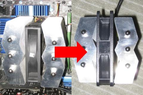 隙間をうめてやったり、はみ出た部分もフィンの間を風が通るように手を入れてやると同じファンでも多少冷却効率が上がることがあります。うまくやらないと振動や風切り音で騒音が増えてしまうことも有りますが。