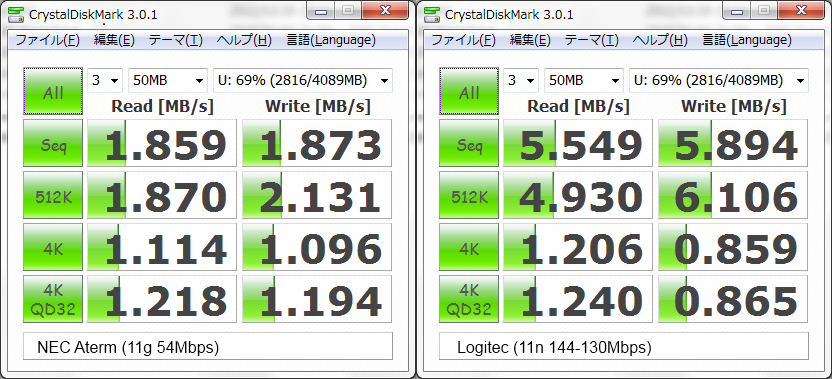 理論値的には2倍+α程度だが、電波強度の向上などもあるのだろう 3倍程度の速度向上となった。