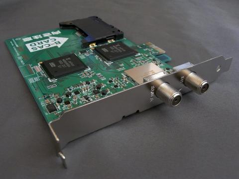 向かって右がUHF/VHF端子、左がBS/CS端子です。カードにはWチューナーなので同じチップが2つ並んでいるのが見えます。その奥にはB-CASカード用のスロット。