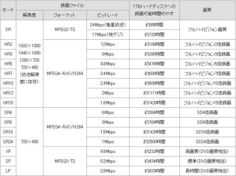 HD画質での録画は下表の通り、劣化なしのDRモードから15倍トランスコード録画のHR15モードまで8種類のモードから選択できます。