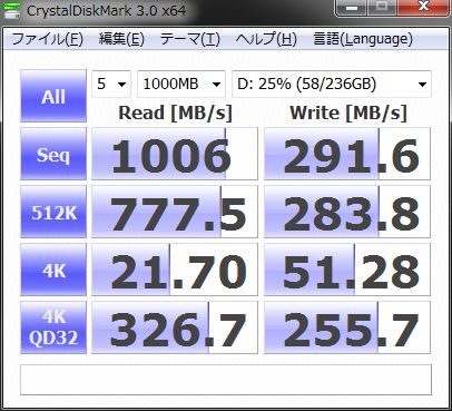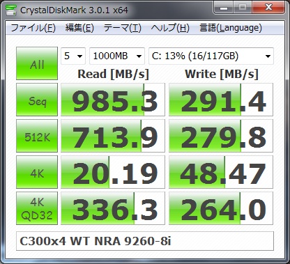 参考までに私の現在のC300 64GBx4 アレイのCrystalDiskMarkを載せておきますね。