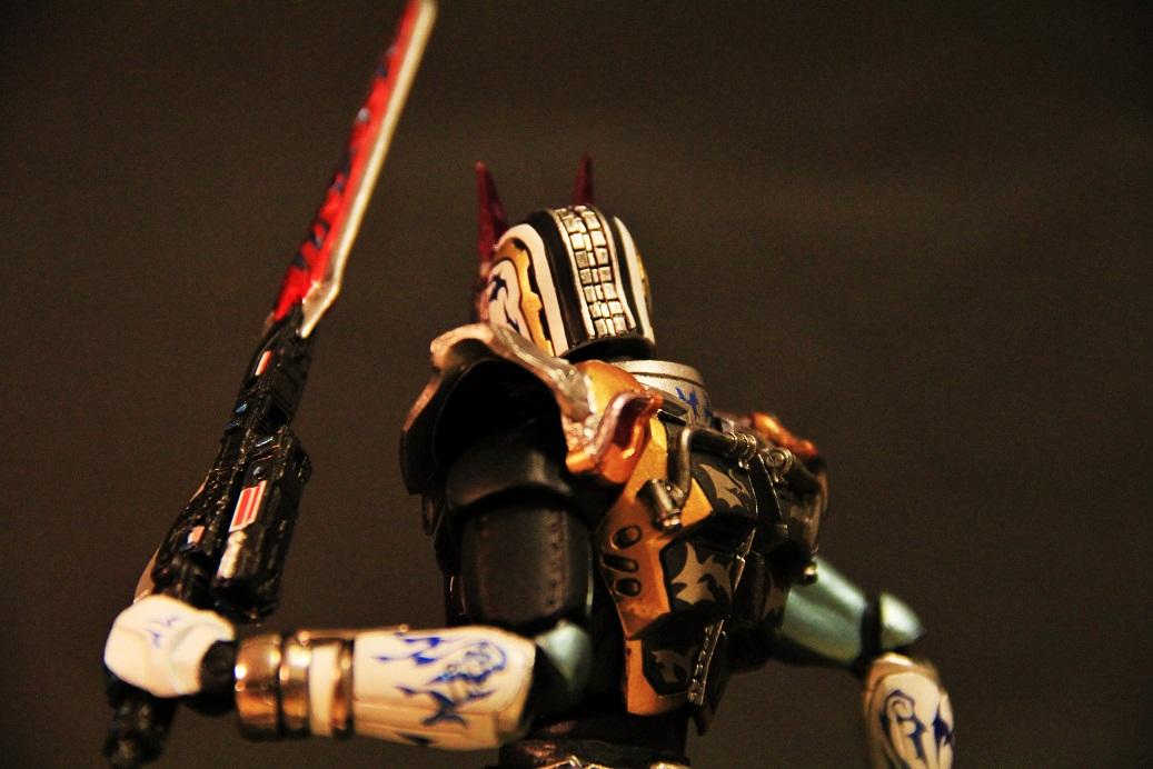 紫と群青を効果的に使用した複眼(ではなく桃だった)や、フレアパターンのように稲妻紋様が走っているところ以外、主役の電王ソードフォーム同様なのに、なぜか頽廃的な悪の匂いがする。