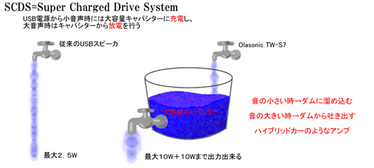 「TW-S7」は新開発「Super Charged Drive System=SCDS」回路搭載により、10W+10Wものハイパワーを実現しています。SCDSと は、例えればハイブリッドカーのようなシステムで、音楽出力の小さいところでは電源部の大容量コンデンサーに充電し、出力が大きなところではその蓄えたパ ワーを取り出すことで、連続して大きな実効音楽出力を可能としました。さらに、新開発の高効率デジタルアンプ、高能率スピーカー・ユニット採用で、他の USBパワードスピーカーを凌駕する高出力を達成しています。