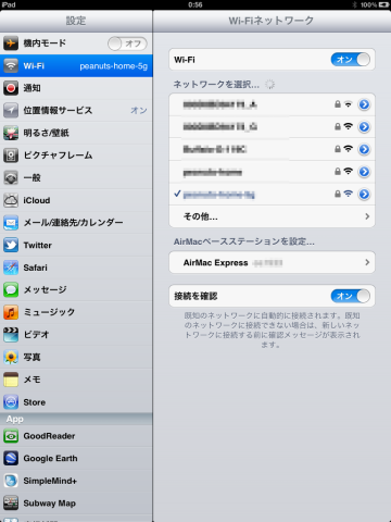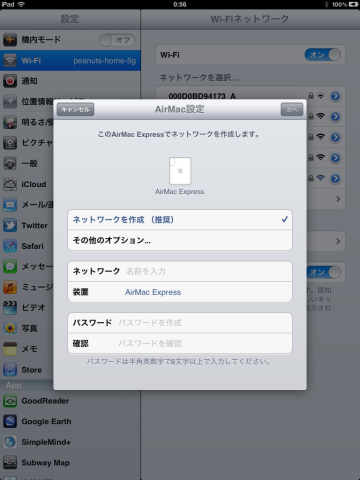 コンセントに差し込んで、念のため初期化してからiPadの設定画面を開くと、AirMacベースステーションの設定項目が表示されています。