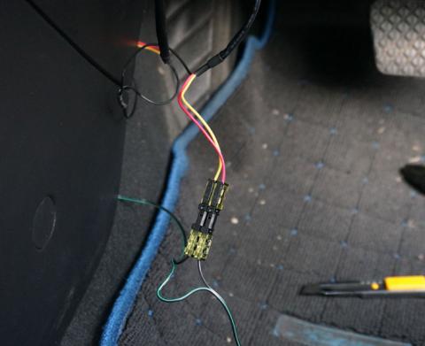 そこで同じくエーモンの接続コネクターを用意。被膜をむく必要すらなく細いケーブルにも対応しているので車内に顔突っ込んだ状態でもかんたん。